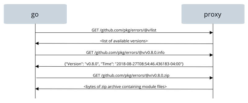 The go command will then request the module’s go.mod file by making a GET request to /{module name}/@v/{module revision}.mod. The server will simply respond with the contents of the go.mod file (e.g. module github.com/pkg/errors.) This file may list additional dependencies and the cycle restarts for each one.